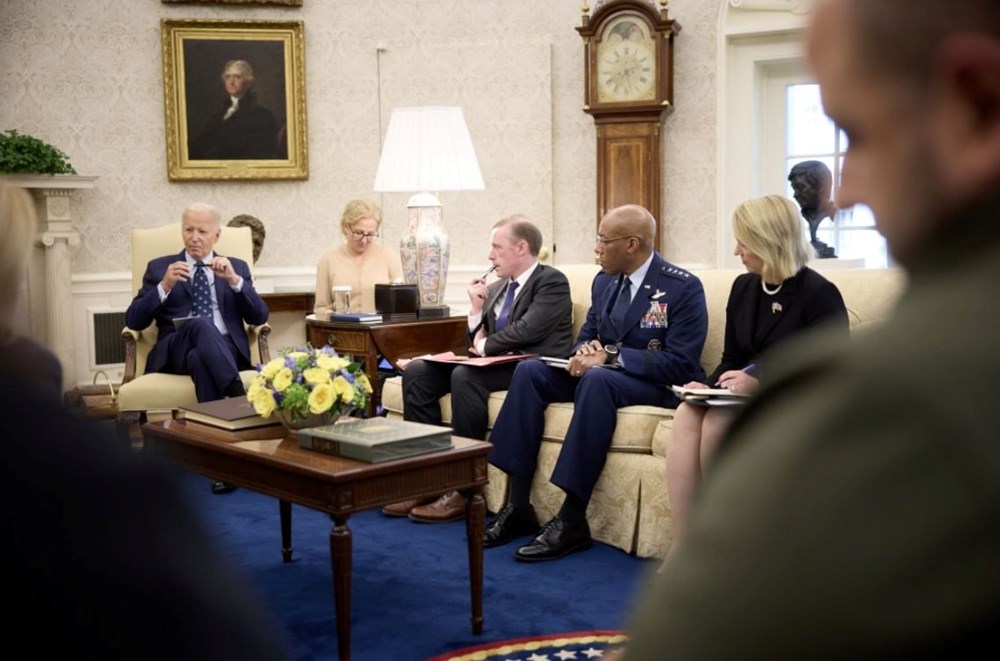 Zelenski, daha sonra Beyaz Saray’da ABD Başkanı Biden ile bir ortaya geldi. İki başkan, zafer planı ile ilgili takımlarına gelecek adımlar konusunda istişarelerde bulunma talimatı verdi.