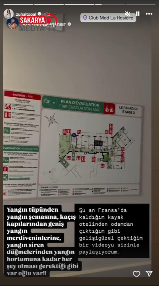 Ertesi gün ise Topal’ın eşi Korhan Saygıner ise Fransa’daki bir kayak otelinden bir paylaşım yaptı. Saygıner, “Yangın tüpünden yangın şemasına, kaçış kapılarından geniş yangın merdivenlerine, siren düğmelerinden yangın hortumuna kadar her şey olması gerektiği üzere, var oğlu var!” diyerek öykü kısmından takipçilerine oteli gezdirdi.